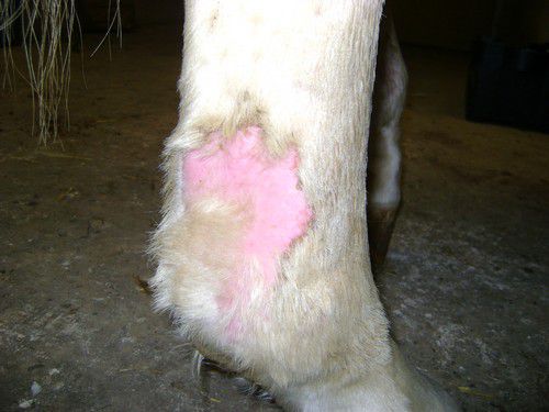 DéconnectéDire merci | Oui. Le cheval d'une amie a eu un problème tout à fait similaire. Les traitements + peau rose + poil tondu par le véto l'ont rendu sensible à la photosensibilisation. Elle ne s'en est sorti qu'en associant les chaussettes (c'est son idée) au traitement, pendant tout l'été. |