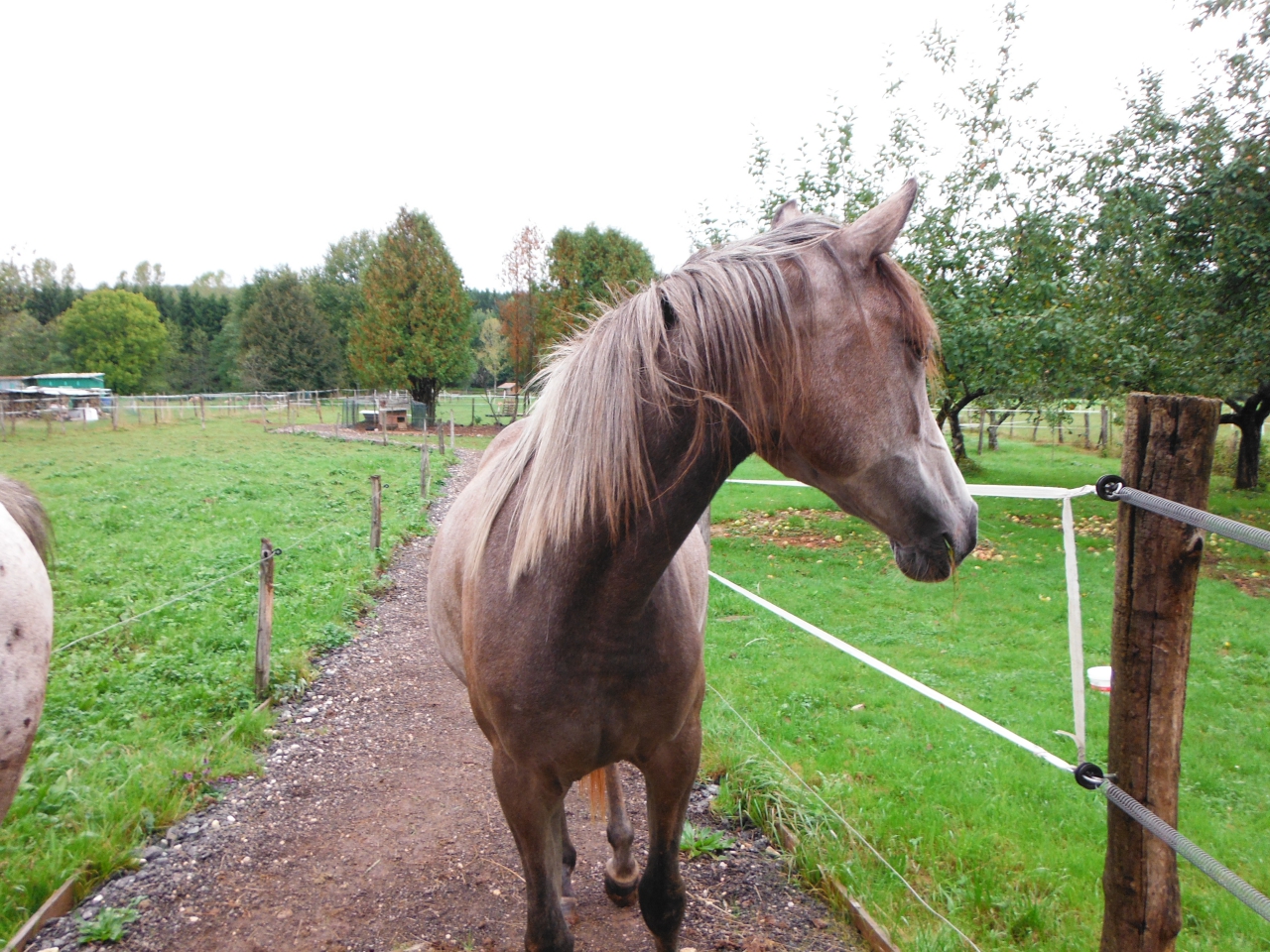 | Dire merci | L'hiver dernier Sherpa était en dans un petit pré au foin à volonté. Assez vite, il n'y avait plus d'herbe dans le pré évidemment, et je me suis dit que je lui donnerais de l'aliment dès qu'il montrerait qu'il en avait besoin (état/énergie au travail). Il avait bien sûr des minéraux en parallèle. Ben au final, le foin à volonté lui a suffit pour l'hiver. ![]() |