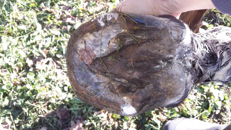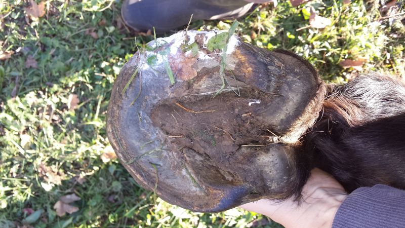 | Dire merci | Voici le postérieur gauche aujourd'hui ![]() ça "saigne" juste en enlevant le hoof stuff doucement avec le cure pied ... |