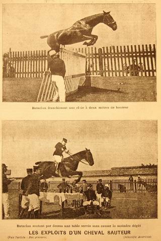 | Dire merci | Cette année là (1902), Bataclan saute 2 m, sans cavalier. A 12 ans, il établit ainsi les records continentaux. En 1901, Bataclan a été le vainqueur aux épreuves de Vichy, Clermont et Nîmes. ![]() |