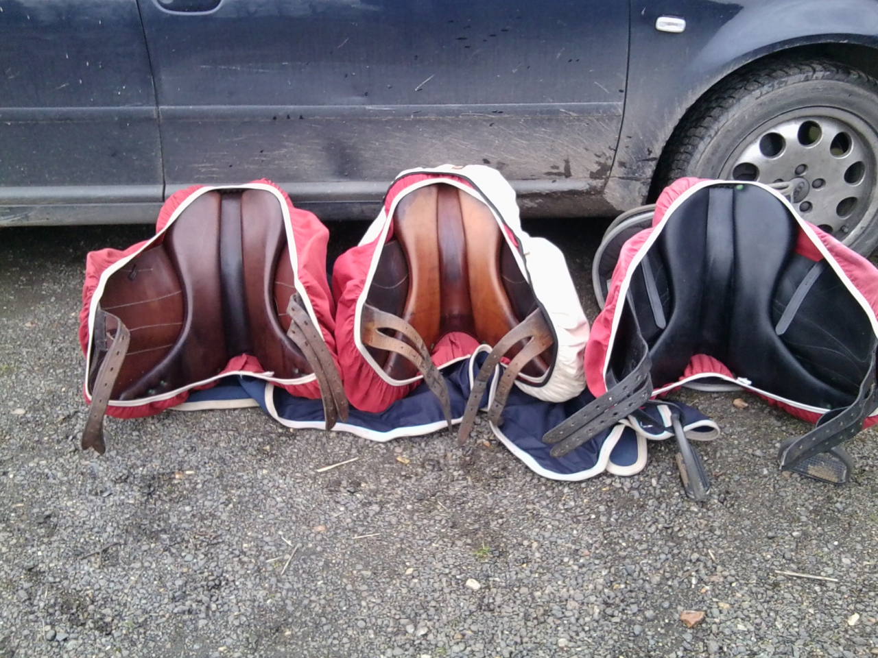 | Dire merci | Je fais du complet avec ma jument (bon d'accord, pour l'instant j'en ai fais qu'un avec elle mais il y en aura d'autres!). Jusqu'à maintenant je n'avais que ma selle de cross pour tout faire (une chiberta achetée neuve il y a 10 ans, j'ai eu de la chance qu'elle aille à la jument donc je l'ai gardé). Je voudrais me faire plaisir et acquérir une 2ème selle, de dressage cette fois-ci. Sauf que je vais pas acheter du neuf, ce sera une occasion, et je pense rester sur Devoucoux. J'en ai essayé 2. Une Milady marron, une Makila noire. Alors mes questions ne concernent pas vraiment la partie cavalier, j'ai bien senti la différence entre les 2 et les 2 me conviendraient (j'aime bien la liberté qu'offre la marron mais j'étais très bien sur la noire aussi). J'ai plus de doute par rapport au cheval. Les 2 selles se sont positionnées correctement je pense, pas d'effet de bascule. Je passe environ 3 doigts entre le haut du garrot et la selle. Mais si je veux "prendre" le garrot dans ma main, je suis bien plus vite coincée avec la milady qu'avec la makila. En fait la gouttière est plus étroite et donc les matelassures appuient plus près de la colonne. Voilà des photos des selles, j'ai demandé à la jument laquelle elle préférait mais elle n'a pas dit grand chose!! ![]() Sur elle: ![]() ![]() Sanglée avec tapis: ![]() ![]() Et mon histoire de gouttière plus ou moins étroite, à savoir que la selle du milieu c'est ma chiberta qui lui va bien (17' pour la cross et 17'5 pour les dressage, la milady marron à gauche, la makila noire à droite): Qu'en pensez-vous? Est-ce que j'élimine direct la milady? |