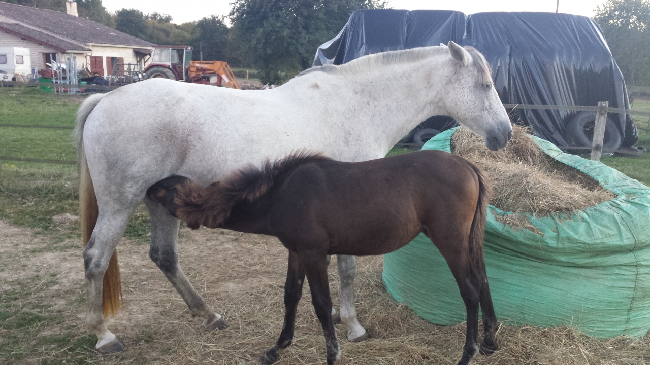 | Dire merci | Ily a encore 3 semaines Jasmine semblait ne pas se soucier de son poulains. Ils ne sont jamais ensemble. Lui joue avec les poneys. Mais maintenant que je l ai un peu promener seul autour des près j ai découvert une jument hystérique et même quand il était encore dans son champs de vision. C est contradictoire car ils ne semblaient absolument pas proche il y a encore qq mois. Je sèvre maintenant car depuis le début c est prévu que Festival aille rejoindre un autre petit mâle qui a 15 jours de moins. La mère de ce petit mâle est pleine et la lactation lui tire dessus alors il faut sevrer. Puis je reste persuadé qu ils sont mieux entre bébé pour ces moments la. Même si j avoue que maintenant je me dis que 6 mois c est un peu tôt. Mais non j ai tout préparer j ai acheté 3 flacons d orotar donc bon ... |