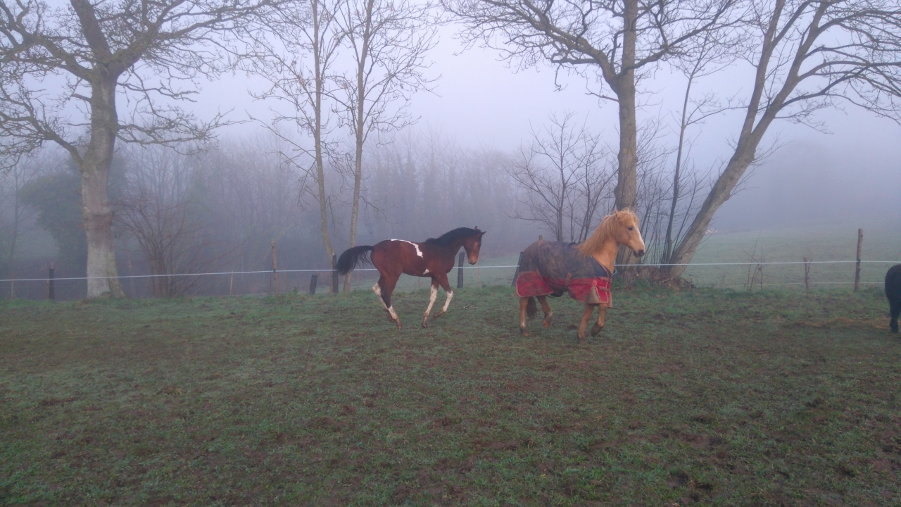 | Dire merci | Sur ce topic on avait déjà échangé sur les conditions de vie de nos chevaux bien plus tôt, c est pour ça que je voyais pas de raison de le préciser. C est pas 9 heures d enfermement par jour 4 mois dans l année qui vont le tuer ou le rendre dingo. Justement au moins il connaît le boxe. Même si durant la première nuit il a tourner en rond puisqu'il venait de perdre ses repères ! Non c est certain que sa mère et Elue (l'autre ponette) ne s en chargeront pas de suite, j ai l air maline si il les rempli !! Il faut composer avec les caractères différents ! On le sait depuis toujours qu il a un gros caractère, sa lui a valu un bout de naseau en moins car il a titillé le cheval du près d à côté par dessus la barrière . On l'a vu qu au matin donc pas possible de recoudre, ça lui donne un charme. Avec les 5 autres jeunes, il n y en avait qu un seul au dessus de lui. Et il essayait constamment de le défier. La castration ne changera pas le fait qu il sera dominant dans mon troupeau. Ça changera juste la maniere de le faire. Actuellement ses parties de jeux deviennent vite de mini combat avec de jolies plaies et pas de simple griffures de la carrosserie... |