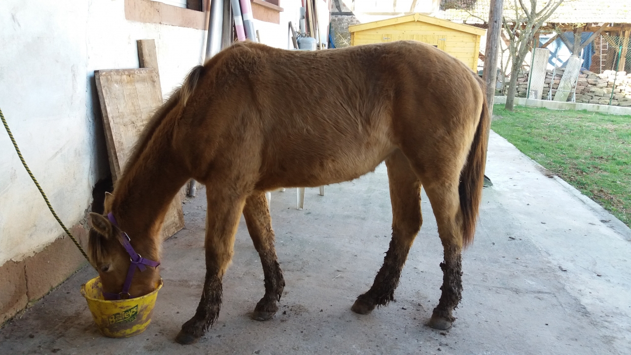 | Dire merci | Si c est comme pour mon mini il y a 2 ans ce sera à la maison, couché au milieu du paddock ( ou peut être debout ça c est le veto qui choisira) Et après il sera au paddock individuel pour éviter qu il saute sur les autres mais au boxe la nuit pour ne pas tout changer dans ses habitudes. Question soin rien ! Juste des médocs dans la ration, pas de douche ni rien !Des qu il sera calmé et que les juments seront là ce sera prè H24. Comment va Fac? |