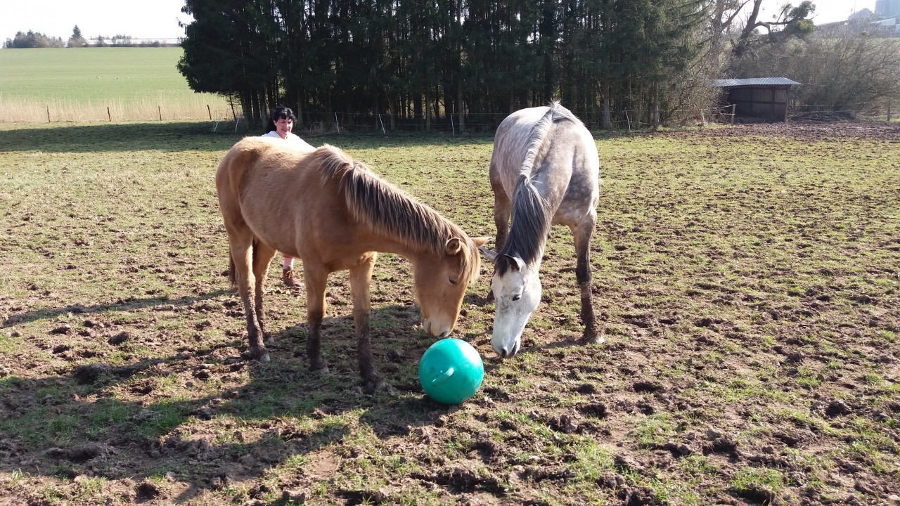 | Dire merci | J'avais acheté un gros ballon rouge à ma C, et elle jouait avec, bon mes pré étant en pente, je ne lui ai jamais laisser pour qu'elle s'éclate quand elle veut mais elle provoquant un peu le jeu avec elle (et au clicker aussi) elle venait le toucher et le pousser, elle avait même essayé de monter dessus ^^ Je te rassure, pouliche elle était pas des plus démonstratives (et pourtant 75% arabe), c'est rare où je l'ai vu la queue sur le dos à faire la nouille dans tout le pré, ça ne m'a pas inquiété tant que les autres paramètres étaient bons (état général, pied en bon état, beau poil etc...), en étant H24 dehors ils ont pas un réel besoin de se défouler et après c'est aussi à voir avec chaque individu |