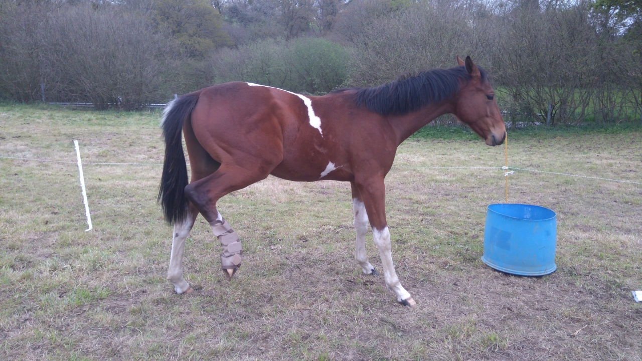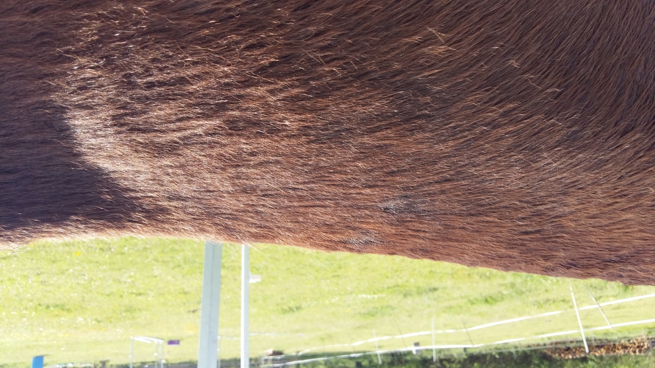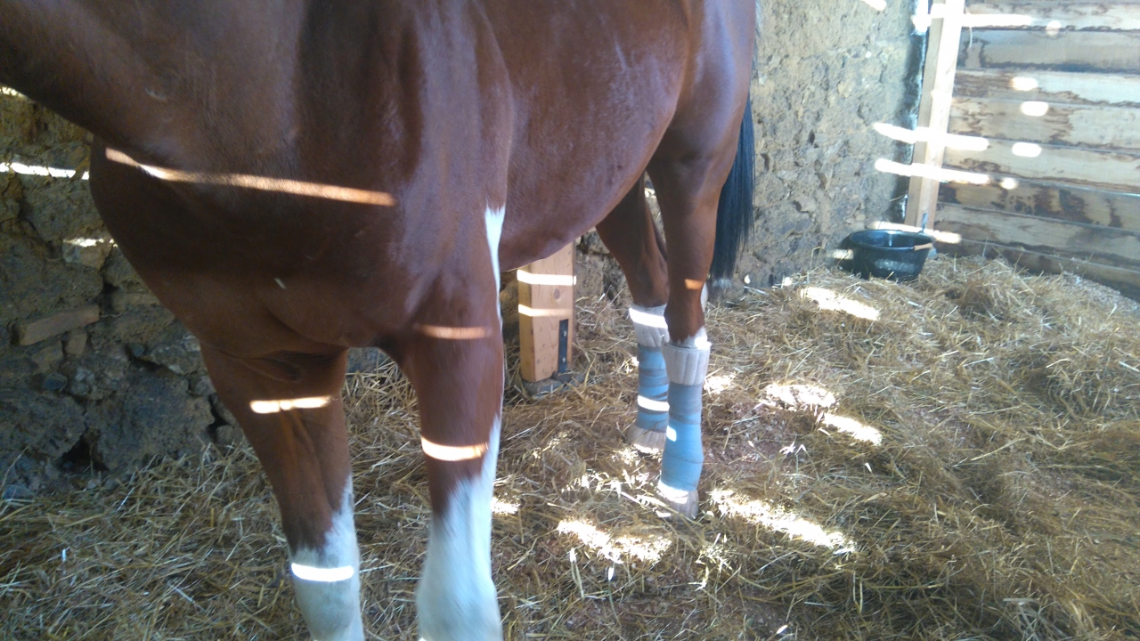 On n'arrive pas du tout à traiter sa photo dermatose. Du coup il se retrouve en permanence avec des bandages humides pour assainir ses jambes. Les postérieurs sont très touchés sa remonte sur tout le boulet et la face externe des canons. Devant il n'y a qu'un membre sain et l'anterieur gauche très peu touché !