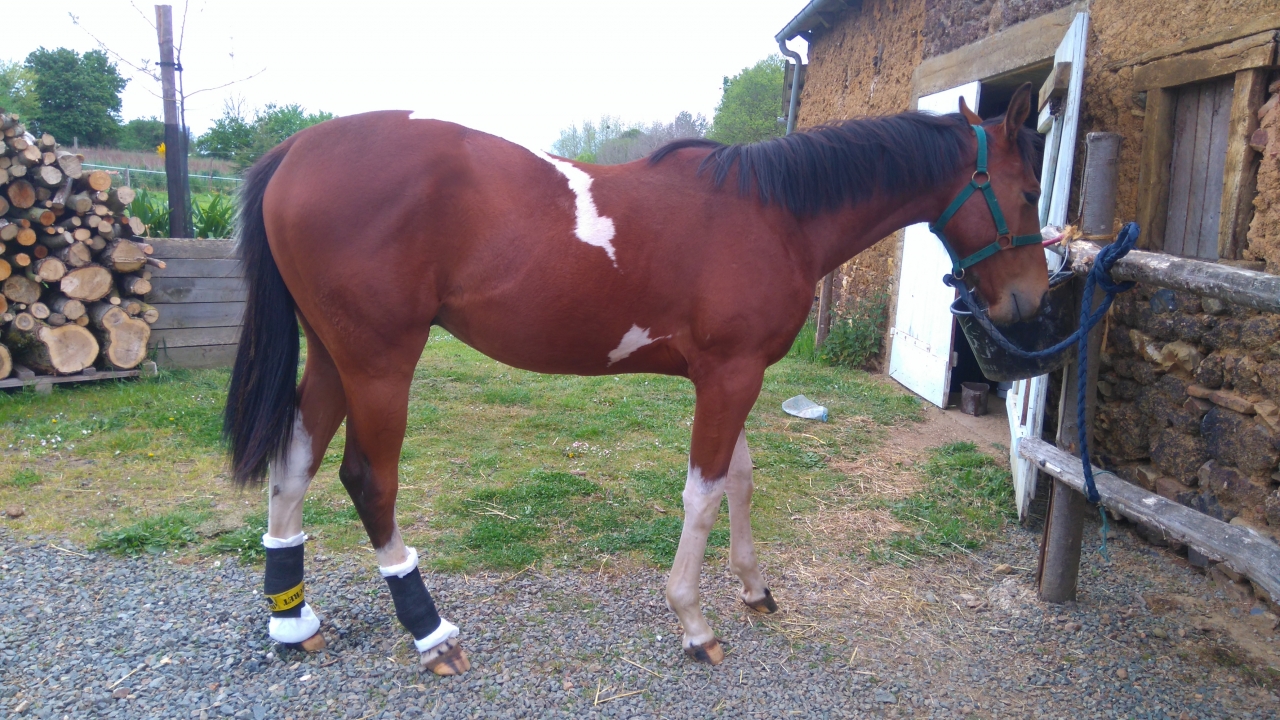 | Dire merci | Jasmine fait 1m63. Bon Festival est parti pour quelques jours de boxe ferme On n'arrive pas du tout à traiter sa photo dermatose. Du coup il se retrouve en permanence avec des bandages humides pour assainir ses jambes. Les postérieurs sont très touchés sa remonte sur tout le boulet et la face externe des canons. Devant il n'y a qu'un membre sain et l'anterieur gauche très peu touché !![]() Comment va ton bébé dodher ? |