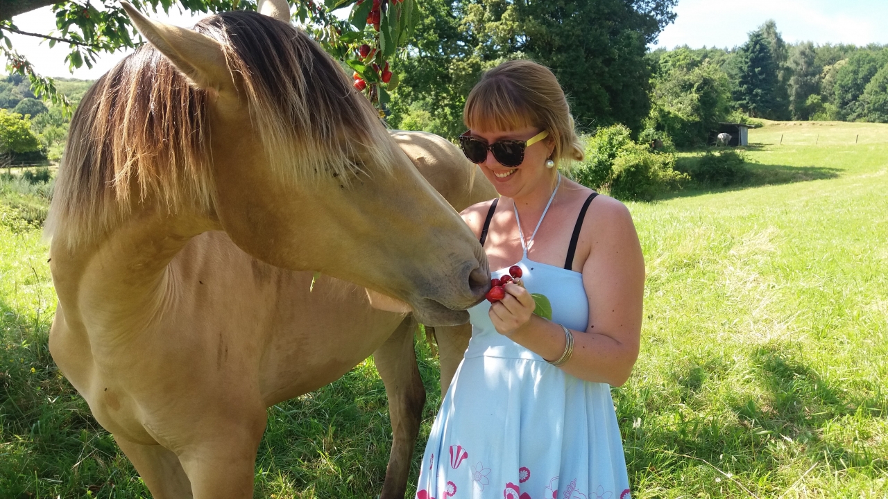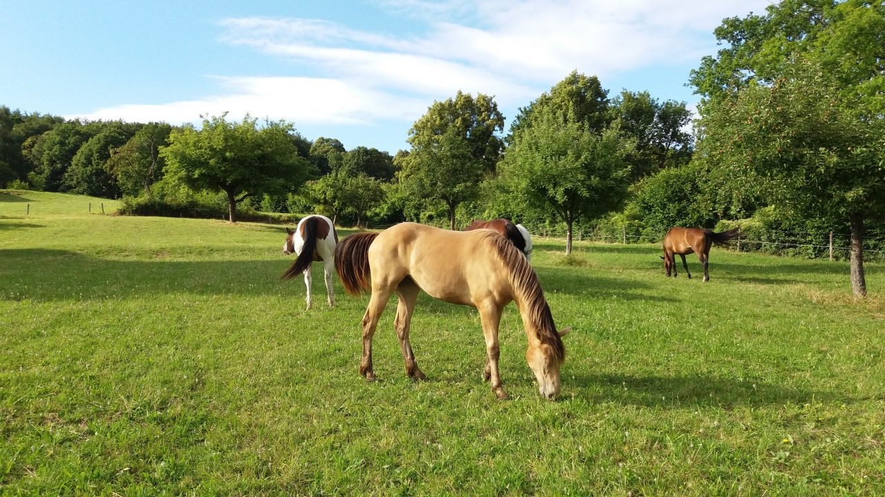 | Dire merci | Les soucis de boiterie de Féerie sont partis aussi vite qu'ils sont arrivés ... mystère ![]() Heureusement cela a permis qu'elle intègre les prés d'été de la pension avec 4 autres chevaux dont 3 qu'elle ne connaissait pas... le premier jour elle se faisait pas mal chasser par le hongre dominant du groupe, second jour elle semble déjà bien intégrée... ouf Le pré est juste sublime, vallonné avec pas mal d'arbres fruitiers et une superbe vue... Féerie se délecte des feuilles de cerisier et est encore plus pot de colle qu'à l'accoutumée... ![]() Lien Message édité le 11/07/16 à 00:46 |
