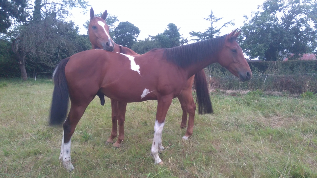 | Dire merci | Clair qu'avec un qui reste seul ds le pré et s'énerve et l'autre qui doit partir suel et s'énerve c'est pas évident du tout à gérer Pour les sorties j'ai fais pas à pas car au début c'était pas gagné de la prendre seule alors que les autres étaient au pré à faire leur petite vie j'ai bcp travaillé en restant à vue et puis seulement je suis partie plus loin |