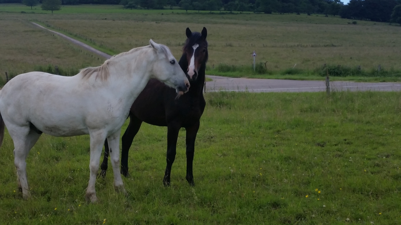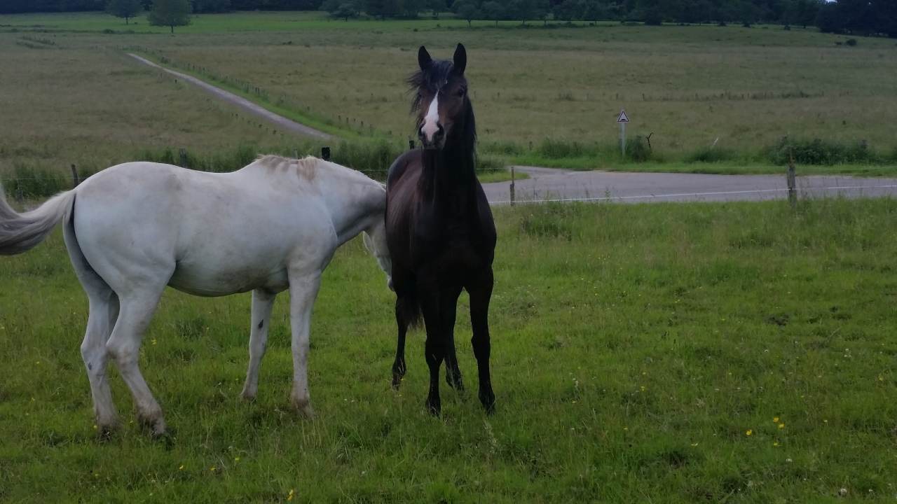 Déconnecté | Tatouchka j'ai déjà testé plusieurs subterfuges mais rien y fait. Ils sont love les deux Le seul moment où le petit à était tranquille c'est après les avoir complètement séparés pendant deux jours sans qu'ils puissent se voir et s'entendre. Là j'ai pu manipuler le petit sans que ça parte en cacahuète... mais au bout de deux jours j'ai craquée, j'ai culpabilisé de les voir tout seul dans leur parc je les ai remis ensemble (d'ailleurs les retrouvailles étaient trop belles, ils étaient trop content les deux.) Du coup je suis pommé. Puis j'ai quand même l'impression que du coup c'est difficile de "creer" une relation avec le petit vu que son référent c'est mon papi. Le seul moment où il arrive au galop du fond du pré c'est quand j'arrive avec le floconné. |