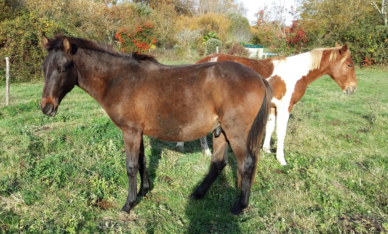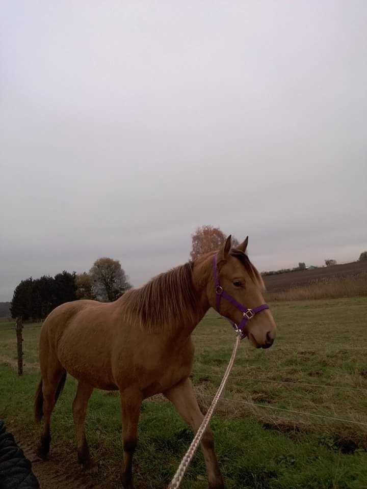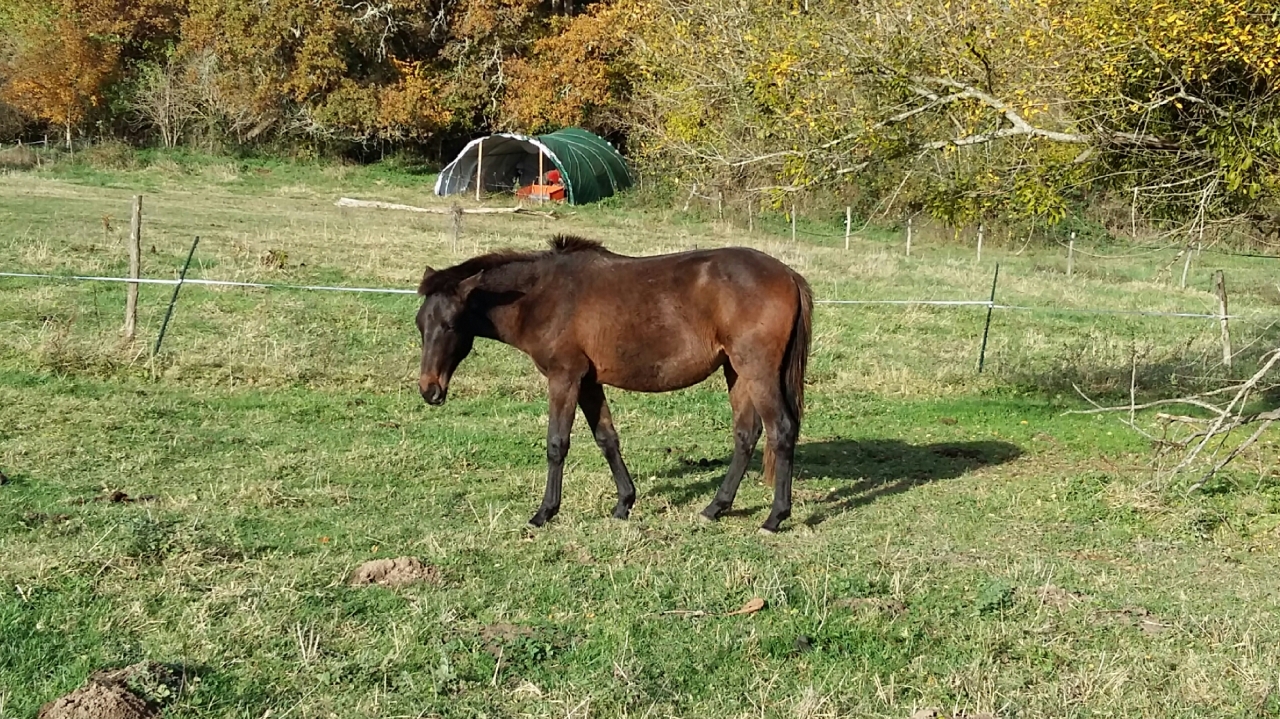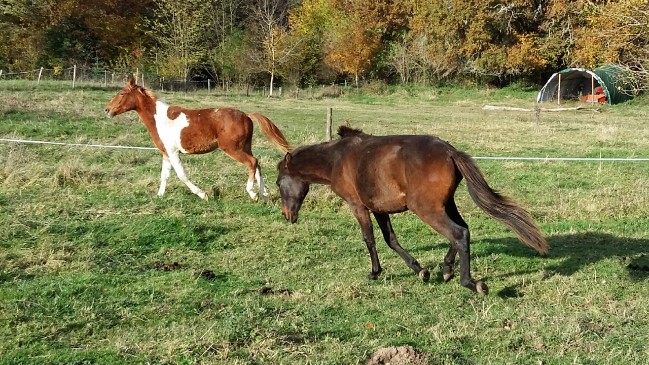 | Dire merci | L'avantage des américains, cest que même petits, c'est tellement tanké (quand c'est bien élevé ...) que même les grands ne font pas ridicule dessus. J'ai connu un mec qui avait acheté une jument d'1m45, lui en faisait 1m80 pour presque 100kg, ben bordel ils allaient bien ensemble L'hiver a commencé chez nous, on a rentré les loulous ce week end. Vendredi Mira/Fawny puis Eyota/Satinka, et hier on est allé chercher les hongres. Pour rappel, Mira et Fawny ont passé tout l'été ensemble et sortaient au manège ensemble l'hiver dernier, ça fait donc 13 mois qu'il vivait avec elle H24 (ils étaient à côté au box avec contact direct, donc on peut vraiment dire qu'ils ont vécu ensemble lol). Mais les bonnes choses ont une fin, hier Mira est allée avec lees hongres en stabulation ... Titi a donc "perdu" sa copine, ça lui a déplu pendant 2min ... Puis il s'est fait à l'idée et tout va bien Hier petite séance de travail à pied au paddock, aujourd'hui j'ai pu le lâcher (on a fixé le portail pour fermer le paddock ce matin, on était pas en avance...). Une photo d'hier, il est pas très grand mais il est très tanké ! Et toujours aussi calme et agréable ... ![]() |