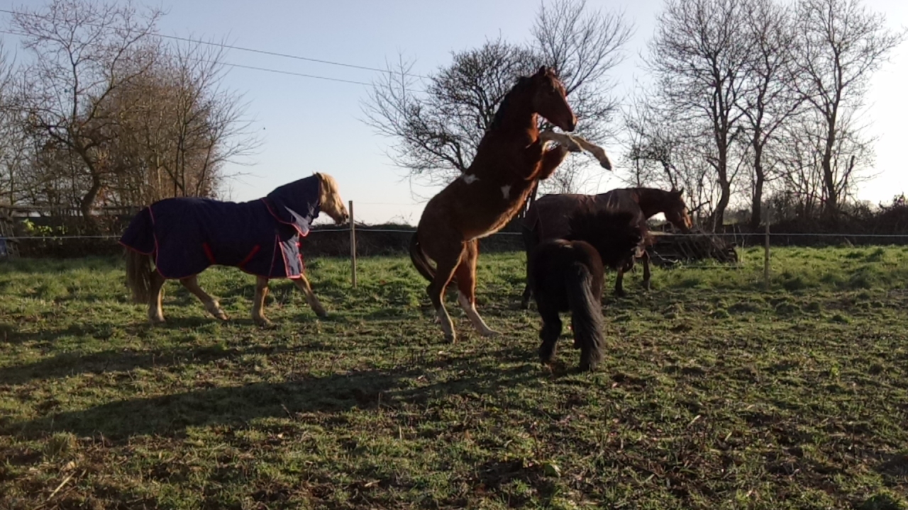 | Dire merci | irisetquiara39 , moi je n'ai pas encore oser sangler Dakota, mais la selle posée sur le dos, ça ne lui procure pas d'émotion particulière. Elle prend également le mors sans difficulté, mais de toute façon, elle fout tout à la bouche comme les bébés ... Sinon, je l'ai sortie cet aprem malgré la tempête (elle n'était pas sortie depuis 15 jours et c'était la première fois que je la laissais aussi longtemps sans rien faire). Alors je ne sais pas si c'est la tempête ou le fait de ne pas être sortie depuis longtemps, mais elle était bien infernale au départ, cabré, tentatives d'évasion et de coups de tête, c'est bien la première fois qu'elle était aussi pénible depuis que je l'ai. Elle s'est calmée assez vite tout de même, même si elle était plus sur l'oeil que d'habitude ... A part ça, c'est un tas de boue terrible, je l'ai brossée 3/4 d'heures, mais sur certaines zones, la boue est totalement incrustée... mais bon, je ne me plains pas trop quand je regarde les voisins de pré qui étaient blancs à l'origine |