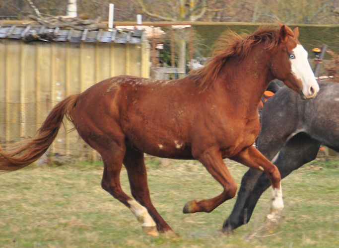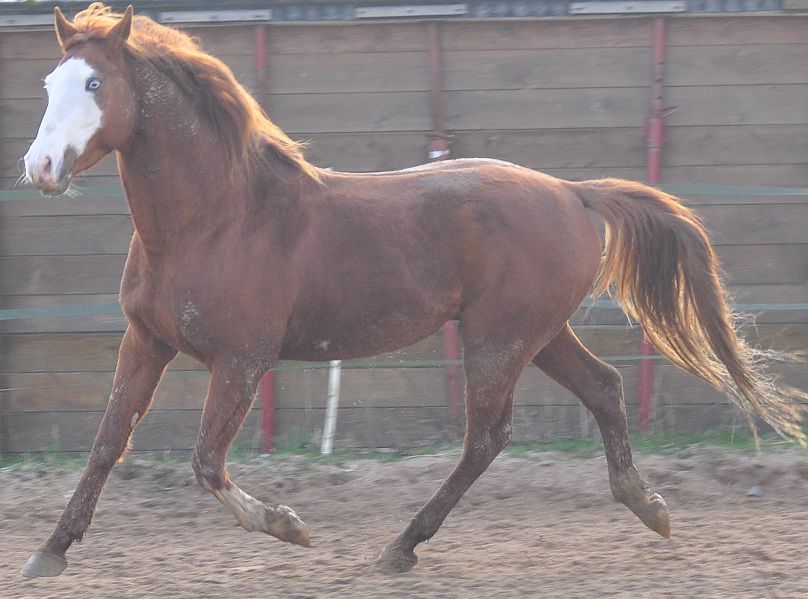 | Dire merci | les poils blancs dans la robe alezane, c'est en général du rubican. Mon vieux cheval alezan a toujours eu des poils blancs éparpillés dans sa robe, et ça n'a pas beaucoup évolué avec l'âge. |