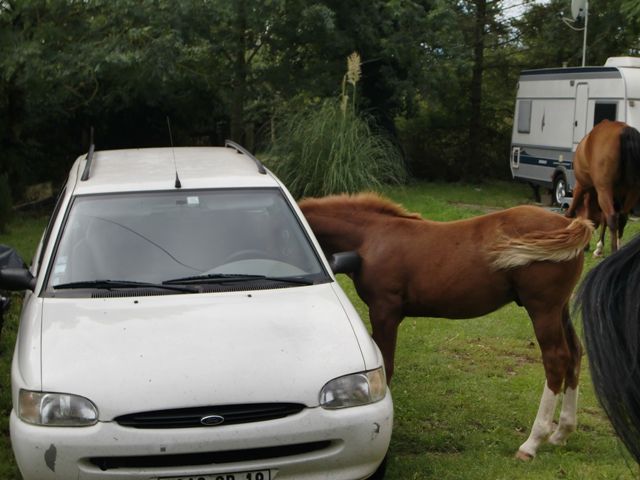 | Dire merci | on ne vois pas bien mais voila une photo ou mon poney est attaché a la voiture ![]() ![]() |