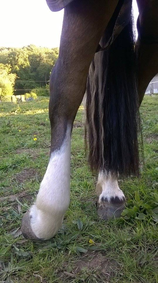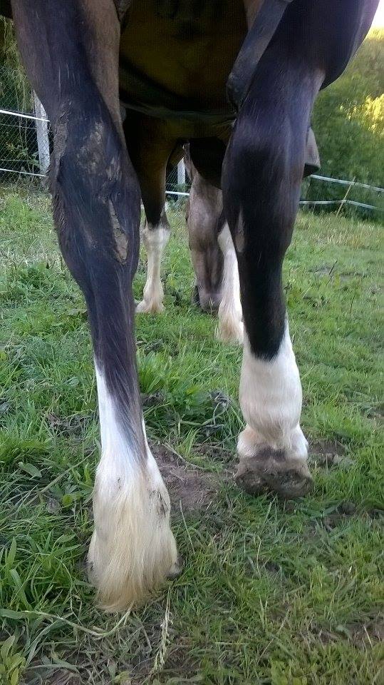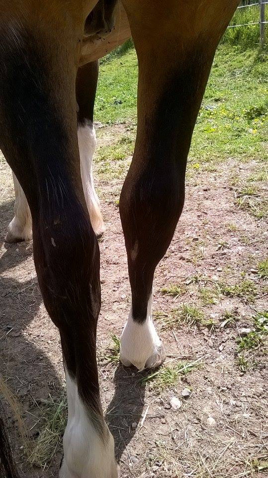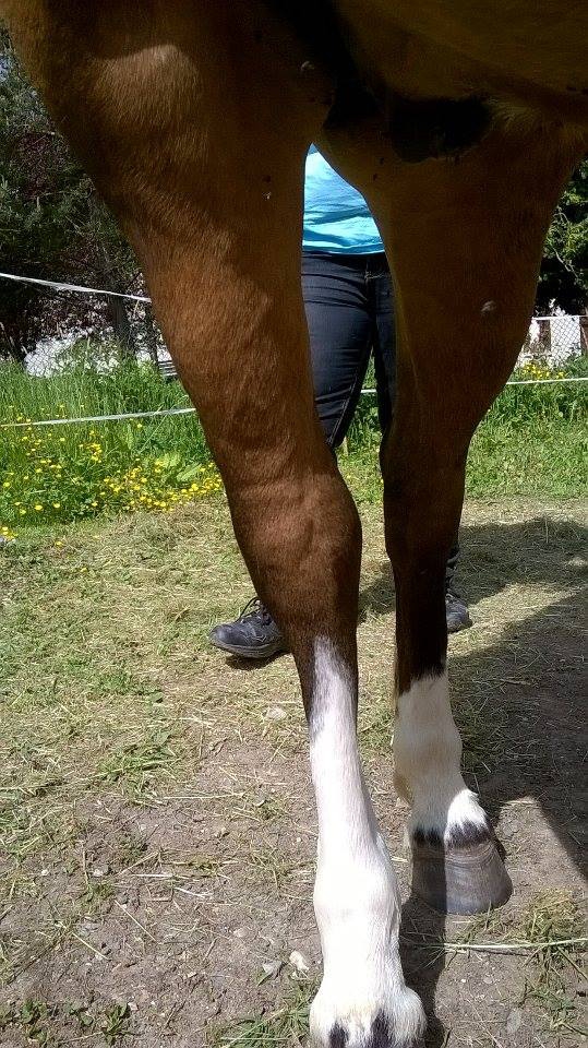 | Dire merci | des news rapide du soir. Duirizone prescris hier et aujourd'hui il n?y à plus rien, plus d?oedème et le poney pose le pied largement mieux, il se déplace pas mal même si encore boiteux évidemment. Pas de température mais maintenant qu'il n'y a plus d'oedème on voit que sur le côté du jarret il y a une légère bosse et nous avons retrouvé dans ses poids d'ours la trace d'un coup de pied juste au dessus du jarret. bref ça se tourne vers une entorse et écho à venir |