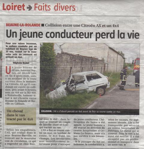 | Dire merci | Là c'est quand même différent, sur une petite route, il roulait à fond, il a fait une sortie de route dans le virage sans freiner ni dévier, le pied au plancher, pile au moment où on arrivait. Les enquêteurs recherchent les causes de sa sortie de route, rien n'est exclu, pas même le suicide. En tant que maman, c'est de toute façon bien triste pour sa famille, on a eu de la chance,on aurait pu y rester nous ou la jument ou rester gravement handicapés. Maintenant, il faut que l'on se remette du choc traumatique et émotionnel, voir quelles seront les séquelles pour la jument. |