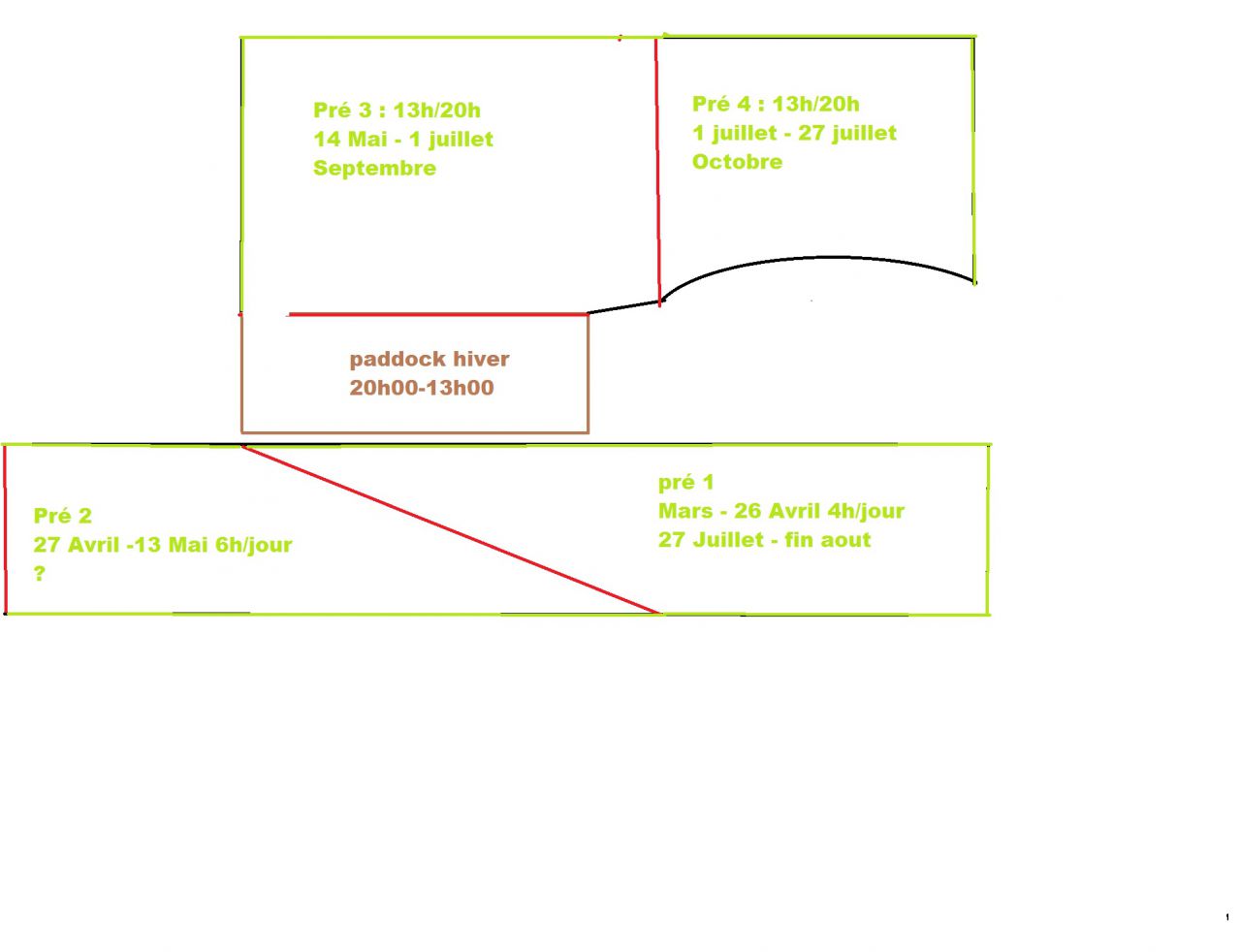 | Dire merci | Oh tiens original! un post sur la gestion des pâtures !!! Allez je vous ai fait un petit shéma pour commencer : ![]() Voila donc comment ça se passe à la maison: 4 parcelles (anciennement trois, mais j'ai du diviser en 2 le pré 3 et 4 à cause d'une faille énorme qui traverse mon terrain )Les chevaux vont donc au pré de Mars à Octobre, progressivement en tournant sur 4 parcelles et rentrent dormir toutes les nuits dans leur paddock d'hiver, de 20h à 13h (ils y ont leur abri et préférent rester planquer de midi à 14h00 à l'ombre et à l'abri des bêtes, ils ont juste un pli de foin le matin et 1l d'orge et ils ont la forme sans être trop gros !) La parcelle 1 m'est prêtée par mon voisin la parcelle 2 également et je ne suis pas sure de pouvoir y remettre les chevaux d'ici la fin de l'été, à elle deux elles représente environ 1ha les parcelles 3 et 4 sont à moi, la 3 étant la plus grande, pareil il y en a pour environ je pense 1ha à elle deux. (je pourrais mesurer sur le cadastre d'ailleurs..) Bref à l'heure actuelle Parcelle 1 a bien repoussé, l'herbe y est haute, parfaite pour acceuillir les chevaux fin juillet la 2 a bien poussée mais a été tondue récemment... la 3 : est bien attaquée MAIS! cette année j'ai eu une parcelle de plus pour faire tourner les chevaux (la 2), du coup l'herbe est vachement montée avant que je mette les chevaux dans la 3, donc ils ont beaucoup mangé mais pas mal écrasé aussi, les herbes écrasée ont jaunies... la je tire un peu parce que les chevaux le mange mal grès le fait qu'il reste encore de l'herbe verte.. et le pré 4 : ba ça continue à monter à monter à monter...et comme je ne peux pas faire le foin je ne peux pas trop tirer non plus donc j'y met les chevaux le 1 juillet histoire de pas trop gâcher en écrasant... voila ma question : je n'ai qu'un rotofil (avec les lames éventuellement), je n'ai pas les moyens d'investir dans plus, et mon terrain ne permet pas le passage d'un gros engin d'agri... Je pensais passer donc un coup de rotofil dans la parcelle 3 dès que les chevaux l'auront quitté pour couper les zones de refus et passer un coup dans cette "paille" car j'ai peur qu'elle étouffe les futurs repousse et je compte sur cette parcelle pour Septembre... Pensez vous que ce sera suffisant pour garantir une repousse ? je suis sud aveyron, ils annoncent un juillet pluvieux et l'année dernière pas de sécheresse, herbe tout l'été... Je peux vous faire une photo des terrains demain ![]() |