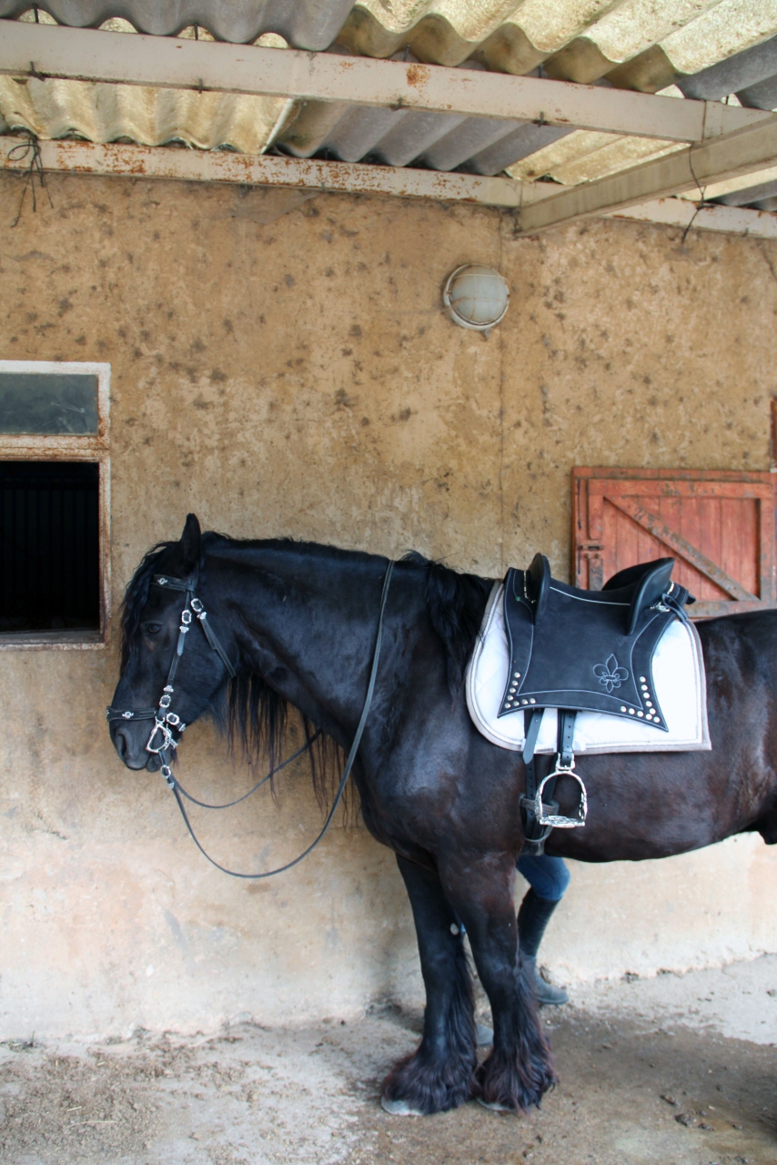 | Dire merci | Dans l'idéal fait en toi faire une sur mesure, c'est ce qu'à fait mon amie. Bon je t'avoue que ça coûte une blinde. Voici une photo pour illustrer, sur un frison type baroque. ![]() Il me semble que c'est un Ludomar mais pas sûr |