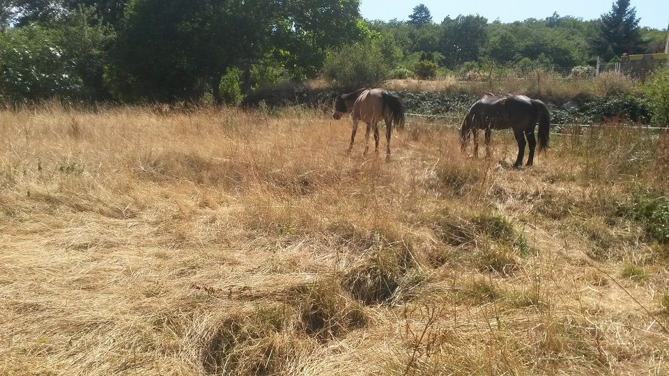 | Dire merci | un pré archi cramé car en plein soleil toute la journée et chevaux dedans pendant un mois là mes trois autres prés sont verts, car deux pas mangés de l'année encore, juste gyrobroyés y a peu les chevaux sont derrière la maison, pré humide donc vert ++++ meme si l'herbe n'est pas haute chevaux en poids de forme, je tire un max pour éviter de donner du foin que je n'ai pas ![]() |
