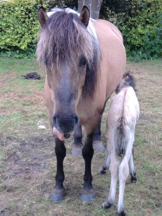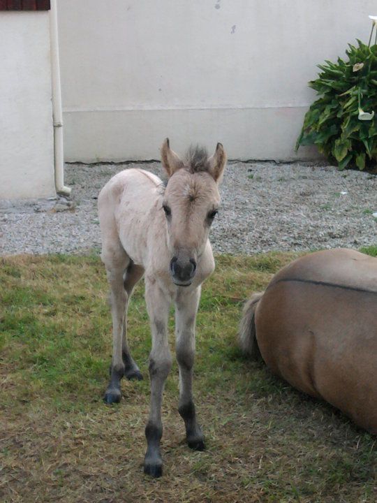 | Dire merci | Bai dun de base (ça se voit sur les photos de lui poulain) et il est grisonnant donc il finira blanc comme tous les gris (y compris son père!) ... |