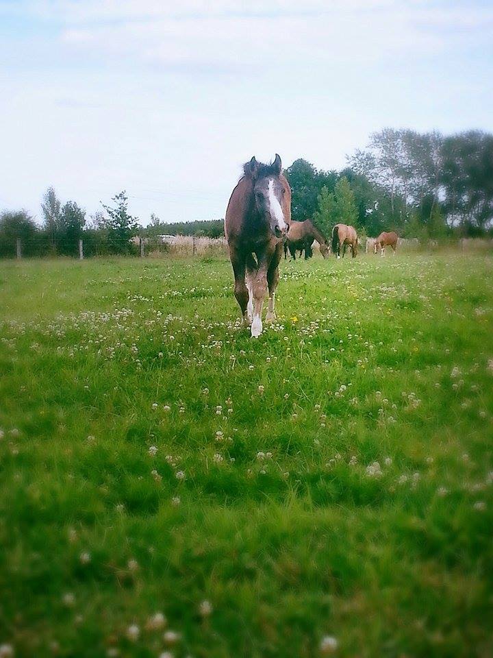 Déconnecté | teh: ouais c'est du rapide! ^^ Elle reste à la ferme où elle est en pension, le truc chiant c'est qu'on part en vacances dans moins de 2 semaines donc on espère qu'elle va nous le pondre avant sinon on va tout rater et ce sera l'agri qui s'en occupera. Je n'ai pas de connaissance dans ce domaine mais j'ai une amie éleveuse et des connaissances éleveuses aussi donc j'ai pas mal de conseils mais de toute manière dès qu'elle poulinera (ou juste après si jamais on arrive et que c'est déjà fait) on appellera la véto direct. Alors je surveille ses mamelles et sa nounoune depuis samedi, ses mamelles ont encore gonflé et ses pis semblent changer aussi mais aucun signe de lait alors on verra. Sinon on ne l'a pas depuis longtemps (fin mars) donc on ne connait pas son comportement d'avant gestation, là elle ne semble pas avoir trop changé. Elle n'a pas du tout voulu quitter son boxe hier (essai midi et soir) donc on n'a pas insisté, aujourd'hui elle est au pré (c'est l'agri qui l'a sortie). On va la voir deux fois par jour. Elle est au pré avec son pote, un hongre de 20 ans. |