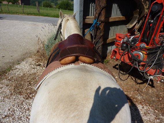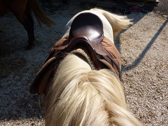 | Dire merci | il faudrait des photos sans tapis Mais comme ça je la trouve immense sur la ponette, et surtout trop en avant, elle doit avoir les épaules bloquées avec. Et le problème si tu la recule elle posera sur les reins. C'est une quelle taille? |
