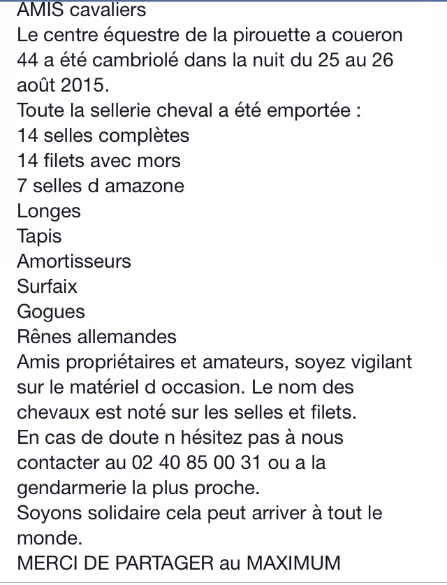 | Dire merci | Bonjour, Je ne sais pas où poster ce genre de message. Je me permets de le mettre ici, si jamais, un modo pourra le déplacer et le mettre au bon endroit s'il vous plait ? Je partage un statut FB du club en question que j'ai vu via un de mes contacts, situé à Couéron dans le 44. Toute leur sellerie club a été volée, de ce j'ai compris... ![]() Merci de partager autour de vous pour eux, et faites attention à vos affaires si jamais vous êtes du coin. PS : je recopierais le contenu plus tard pour éviter que ca s'efface pour je ne sais quelle raison, j'ai pas pu avec mon tel. |