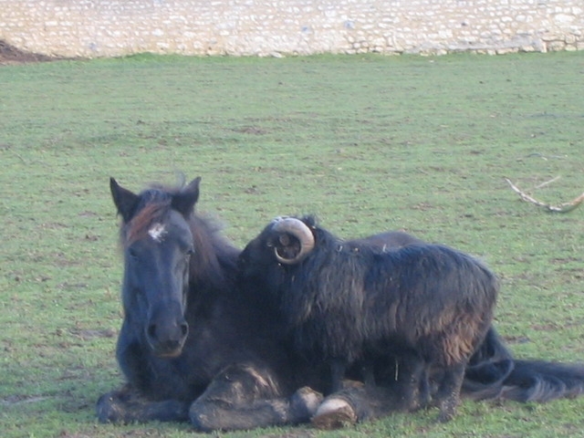 | Dire merci | J'avais des moutons pour tenir un peu compagnie à mon vieux retraité, aucun souci, c'est plutôt l'indifférence positive. Par contre mon bélier est devenu un vrai fan des chevaux, je le trouvais souvent couché sous le cheval, entre ses pieds. Il en était à abandonner son troupeau de brebis pour aller rejoindre les chevaux dans leur pré ! Une fois que les brebis ont été présentées au cheval (pour que ni elles ni le cheval ne prennent peur ce qui aurait pu déclencher une course-poursuite) il n'y a plus eu de souci alors que le cheval a été pénible quand mis en présence de génisses, il a voulu jouer le chien de troupeau et les a terrorisées ! |