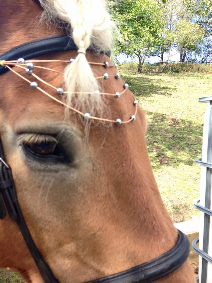 | Dire merci | C joli et tout mais ca ne sert a rien! Ton cheval s'enfiche royalement si il a une jolie bride. En plus si les perles se coincent en dessous de son frontal ca fait mal. Regarde si tu en trouve pas avec des vrais strass chez fouganza! |