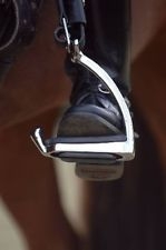 | Dire merci | Fragiliser l'étrier et t'empêcher d'accrocher l'élastique... Je ne comprends pas tes craintes (à part pour ton porte-monnaie !) car le crochet en bas vers le plancher de l'étrier est tourné vers l'extérieur donc non, ne peut pas toucher le cheval pendant la monte. L'étrier que tu montres a aussi l'avantage d'être muni d'un oeil perpendiculaire à la direction de son plancher, ce qui fait qu'il se tient naturellement en position d'utilisation, tu n'as pas à le chercher de la pointe du pied, aucun risque de chausser à l'envers avec l'étrivière qui risque de blesser la jambe. |