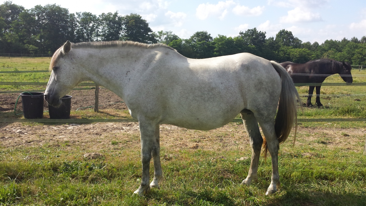 | Dire merci | honnêtement, tu m'aurais montrer la photo de ta jument à +9 mois en me demandant si elle est pleine ou non, je n'aurais pas su te dire. oui, le ventre est un peu en V, mais pas plus que ca, autre signe, elle n'est pas grasse au niveau du poitrail/encolure, mais ce n'est pas un signe très révélateur... |