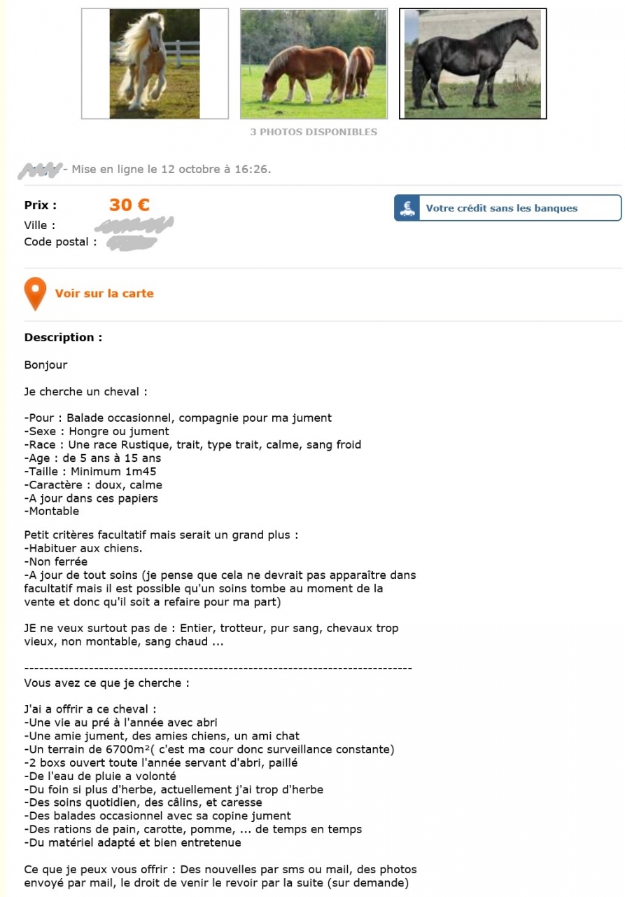 Déconnecté | s'il y avait des gens prêts à bien s'occuper d'un cheval même montable même gratuit, il y en aurait moins dans les refuges (gratuits ET montables) alors non, ça ne me choque pas tant que ça, si la fille est sincère et une cour de 6 Ares, c'est toujours mieux qu'un box |