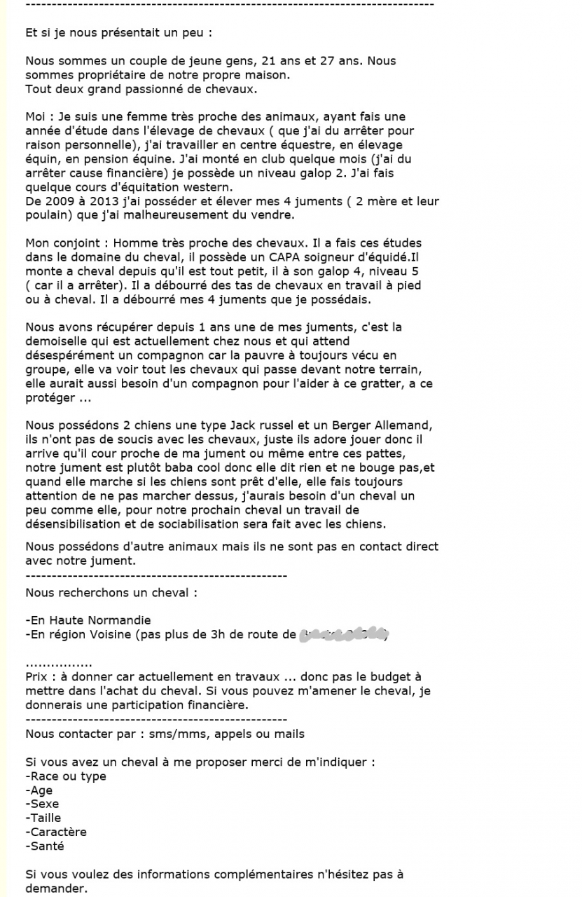 | Dire merci | Oui, mais attention : pas n'importe quoi ! "JE ne veux surtout pas de : Entier, trotteur, pur sang, chevaux trop vieux, non montable, sang chaud ..." Ben oui, quand on a "fais une année d'étude dans l'élevage de chevaux ( que j'ai du arrêter pour raison personnelle), j'ai travailler en centre équestre, en élevage équin, en pension équine. J'ai monté en club quelque mois (j'ai du arrêter cause financière) je possède un niveau galop 2. J'ai fais quelque cours d'équitation western." Et qu'on vit avec un " Homme très proche des chevaux. Il a fais ces études dans le domaine du cheval, il possède un CAPA soigneur d'équidé.Il monte a cheval depuis qu'il est tout petit, il à son galop 4, niveau 5 ( car il a arrêter). Il a débourré des tas de chevaux en travail à pied ou à cheval. " Ben, on peut se permettre d'avoir un minimum d'exigences ! Alors merci d'envoyer une lettre de candidature pour faire accepter votre cheval ! |