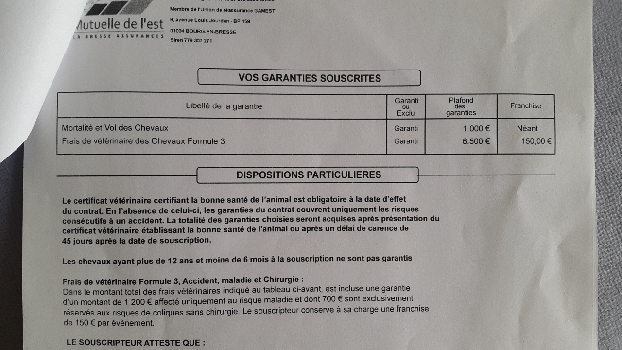 | Dire merci | @sab46 equestrassur prend en charge aussi les chirurgie collique si tu prend l'option par contre je ne me souviens plus du tarif, à vérifier sur leur site... (Pour ma prestation expliqué plus haut je paye env 25e/mois) |