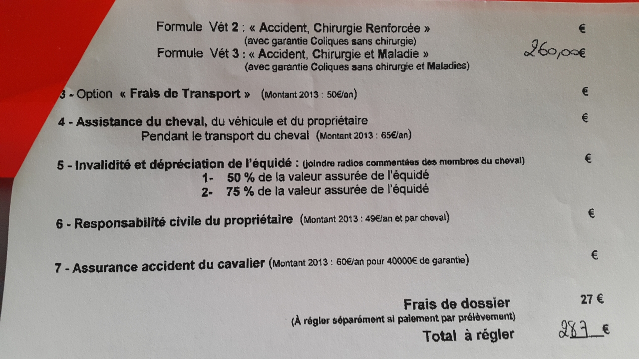 | Dire merci | Après attention, le prix que je paie est aussi en rapport avec la valeur que je donne à ma pouliche... les tarifs ne montent pas très vite si je me souviens bien mais du coup peut être que ça équivaut à d'autres assurance.... à voir... |