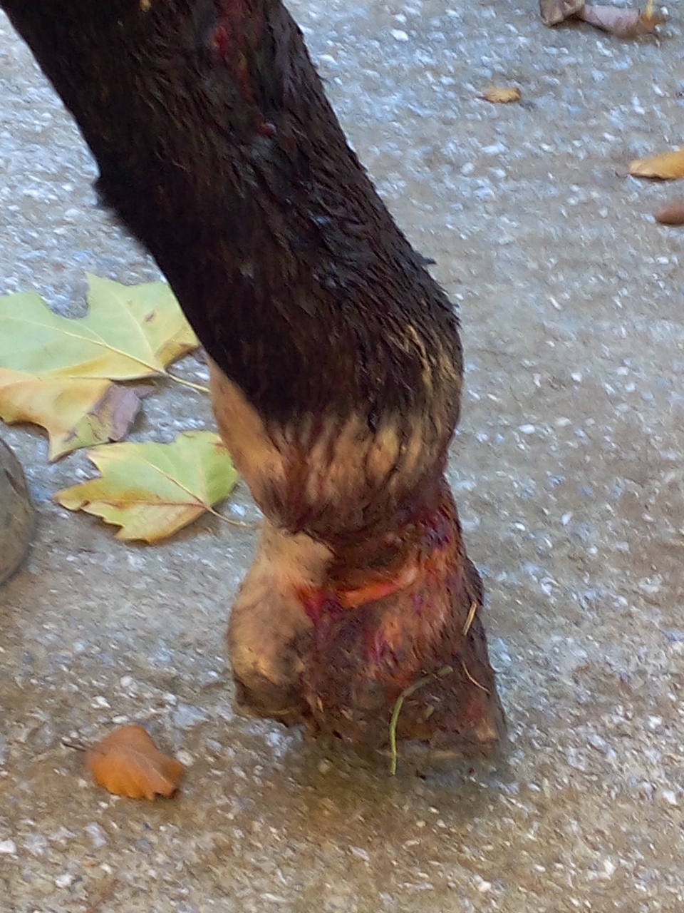 | Dire merci | Je ne vais pas répéter ce qui est dit plus haut pour les préconisations de soins tout a été dit. Il faudrait juste effectivement qu'il soit en box pour la nuit et idéalement en petit paddock individuel la journée, il faut qu'il marche pour stimuler la circulation du sang, pour pas que la plaie se nécrose et qu'il engorge. En produit "miracle" j'utilise le picribaume et le picrispray, ce sont des produits à base de miel, j'ai trouvé ça très efficace quand ma jument s'était ouverte le postérieur et l'auge (pourtant endroit difficile à nettoyer ....). Je douchais avec du savon de marseille et bien sûr la patte était rasée (les longs poils d'hiver à la tête aussi quand elle s'était ouverte à l'auge) |