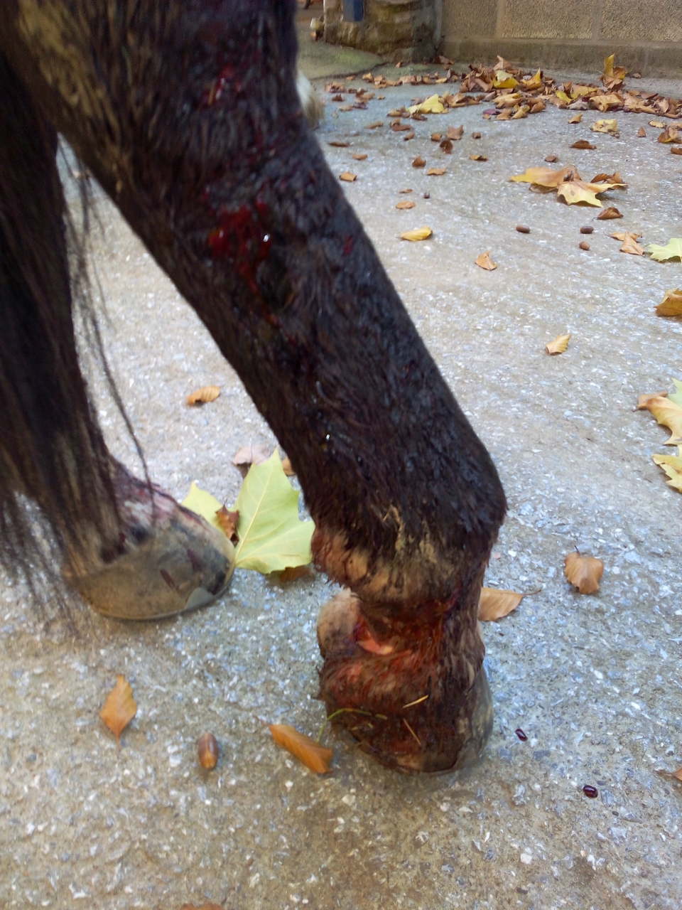| Dire merci | pas de chance.. comme les autres il faudrait nettoyer les plaies et les dégager en rasant le tour. et mise au box bien sur. bon courage pour les soins et bon rétablissement à ton cheval |
