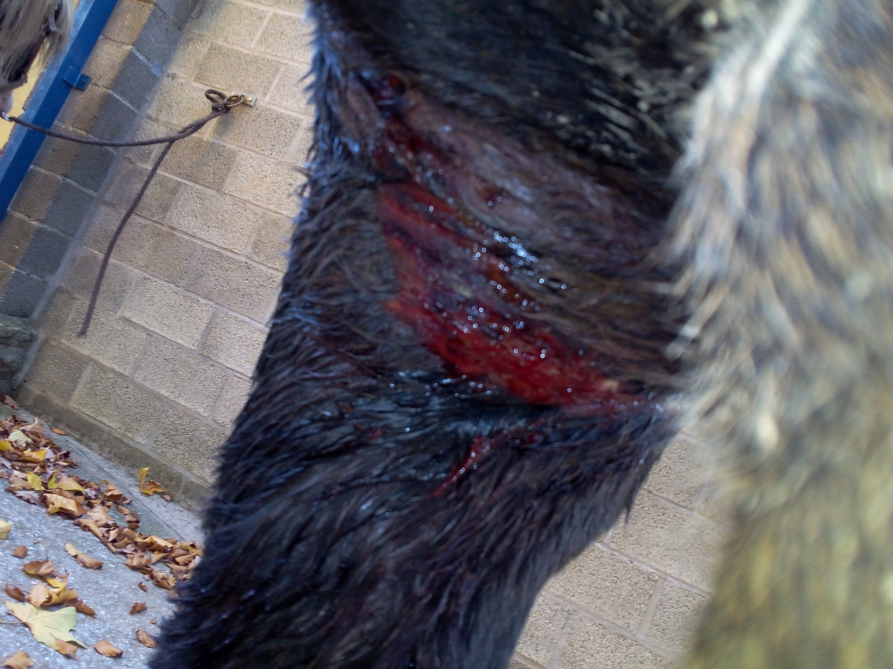 | Dire merci | Quand Goss s'est blessé la véto qui est venue a rasé et nettoyé la plaie. Elle a aussi donné des anti inflammatoires et anti oedèmateux. Je devais nettoyer tous les jours avec de la bétadine savon et ensuite mettre du picribaume. Ça a été très efficace il y a une jolie croûte maintenant. |