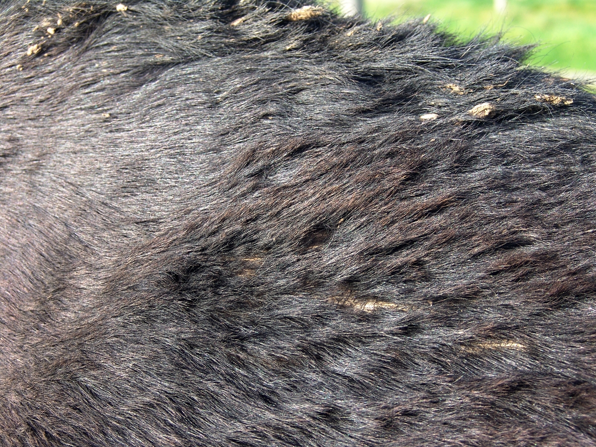 | Dire merci | J'ai enlevé la boue vite fait là où le problème est le plus visible, une zone sous le garrot où la peau est vraiment très moche, j'ai beau hydrater ça ne change pas grand-chose: Pour les vermifuges il était sous Ivomec depuis avril/mai, et Equimax là à l'automne. |