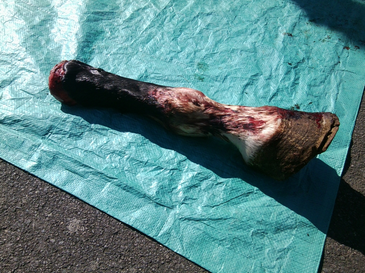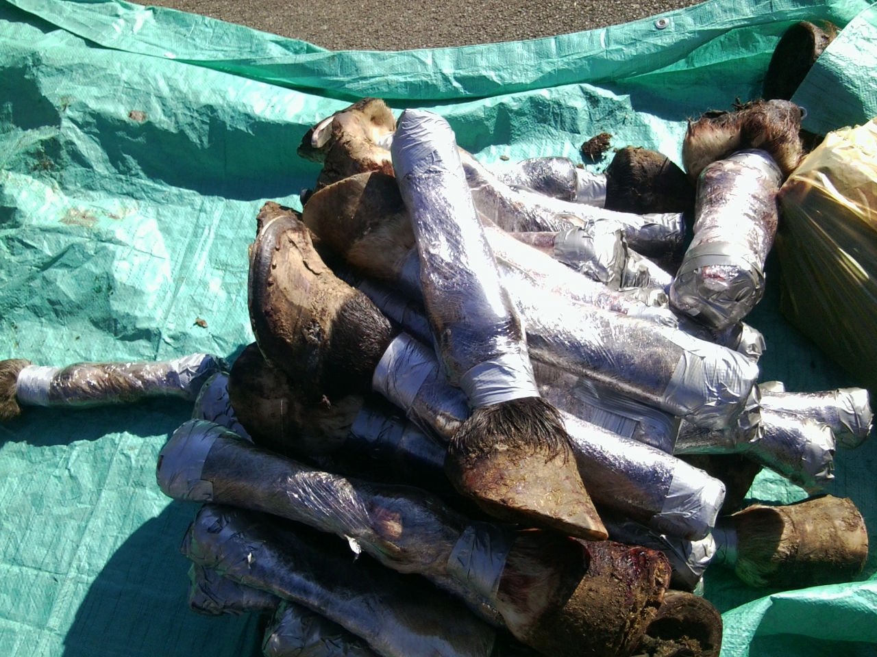 | Dire merci | Quand j'ai fais mon stage, on avait plus de 60 pieds, l'organisatrice n'avait pas pu mettre tous les pieds au congèl, notamment les pieds des chevaux lourds, ils étaient balèzes ceux-là (mais ça allait encore niveau odeur, chevaux abattus le mercredi, stage le samedi/dimanche). pour les emballer on les a enroulé dans du film plastique (ne pas lésiner sur la quantité sinon ça dégouline quand tu bosses dessus ), puis fixer avec du gros scotch gris (pareil, faut plusieurs tours)un détail sur lequel tout le monde n'était pas forcément d'accord car pas au courant avant de commencer : l'évacuation des pieds après le stage. je crois que normalement c'est équarissage, donc payant. certains étaient ok pour payer, d'autres n'avaient pas prévu ça dans le budget. Spoiler