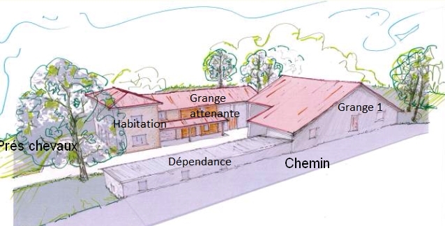 | Dire merci | Seule la grange attenante donne sur le pré, mais c'est un peu compliqué comme montage, puisque j'achète avec des amis, et que nous nous sommes séparés l'immobilier en fonction de nos projets respectifs et des permis obtenus. La grange attenante ne m'appartient pas et sera une habitation, la grange 1 est coupée en 2, et seule la partie donnant sur la cour, où était l'ancienne étable m'appartient. Et si je relie donc les dépendances qui font (enfin feront) partie de ma propriété, je bloque l'accès au chemin et à la cours en faisant un couloir jusqu'au pré. D'où la difficulté. Je n'ai pas mis de photos / images au départ, car ce n'est pas forcément représentatif du projet final. |