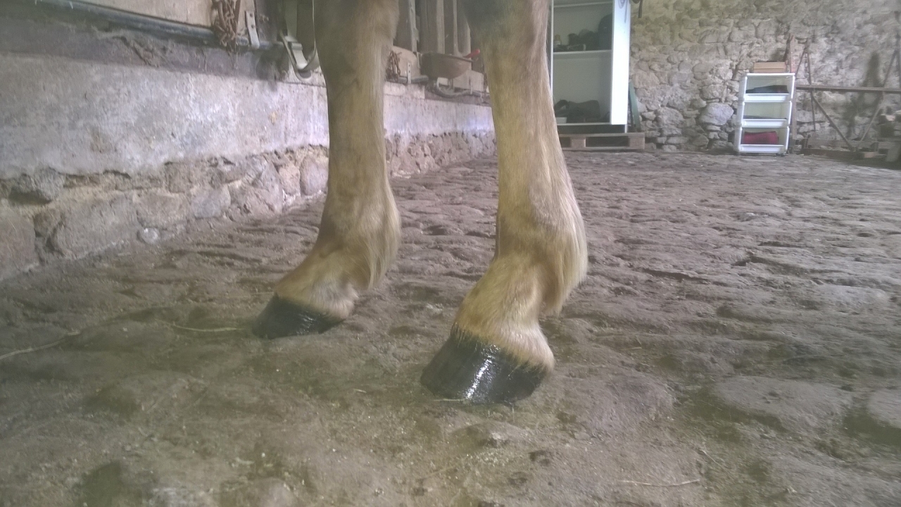 | Dire merci | Mon cheval a un suros coronaire à l'antérieur gauche, qui a été opéré et qui est revenu.... Pour lui de toute façon c'est cloches obligatoires car il est ferré sans pinçon devant donc risque de déferrer, du coup ça protège aussi le suros. Le sien est énorme par contre, et ça a provoqué l'apparition d'un pied bot (il a dû énormément compenser sur l'autre membre) donc je fais gaffe avec ça.... Photo à son arrivée en Juin dernier, depuis le suros a fortement diminué et si on ne sait pas pour le pied bot on ne voit rien, mon maréchal a fait du super boulot, la ferrure a énormément aidé. ![]() |