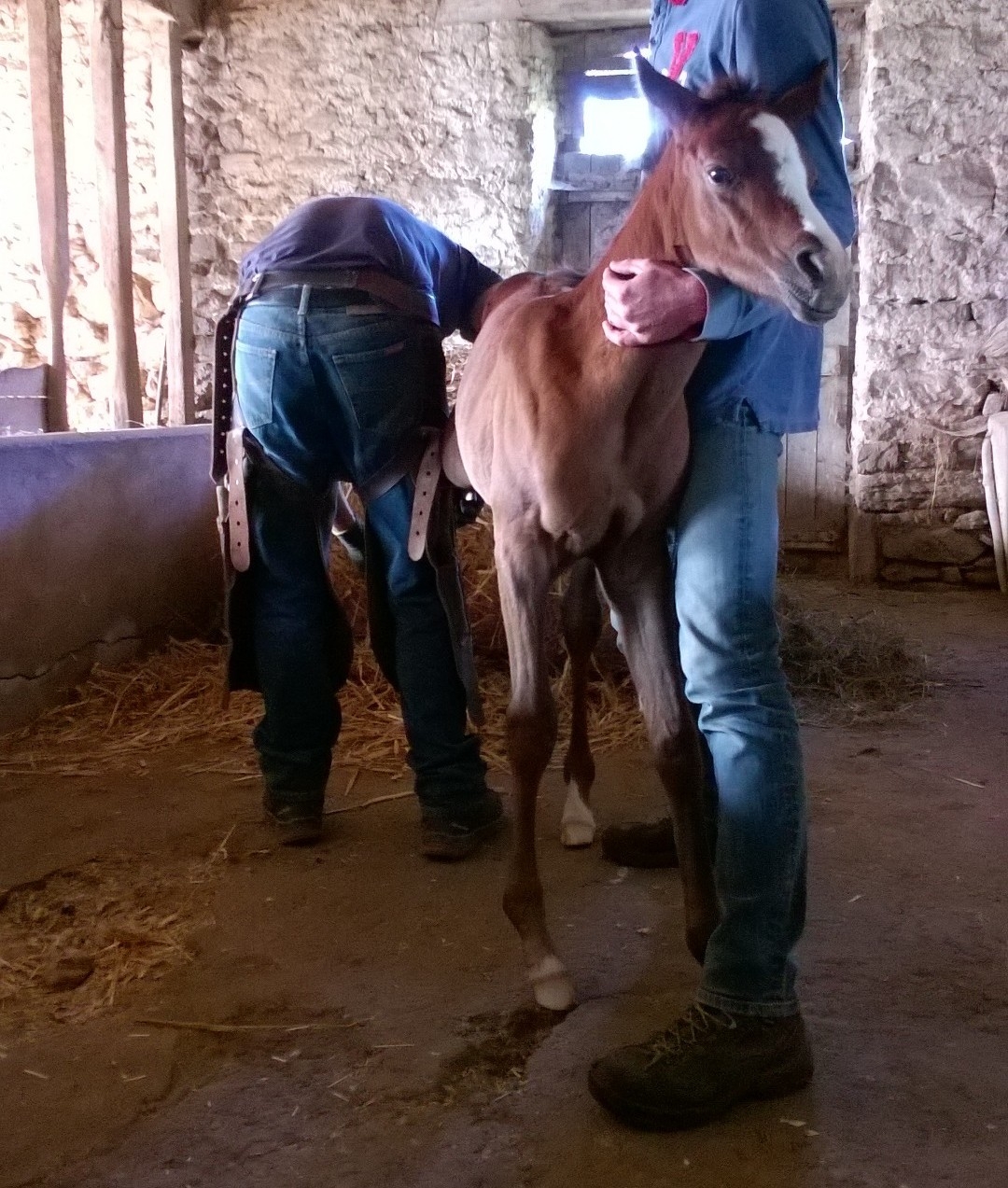 | Dire merci | 1er parage pour ma pouliche aussi hier, à 15 jours. Le maréchal est venu pour sa mère, j'en ai donc profité pour lui montrer la miss qui est un peu trop sur les talons postérieurs. Il l'a donc parée, il revient dans 15 jours pour la parer encore et éventuellement lui mettre des fers en plastique collés, mais le parage d'hier l'a déjà bien redressée c'est impressionnant! ![]() Une formalité pour la petite, qui est vraiment pot de colle, trop pot de colle même, on doit la remettre à sa place car elle essaie déjà de mordre et elle a le cul leste.... Alors c'est mignon et rigolo, ça fait marrer tout le monde, mais nous on pense à plus tard, ça sera moins mignon quand elle le fera à 1 an ou 2 ans..... Elle hennit dès qu'elle nous voit et arrive au galop, elle gueule à l'entrée du paddock quand on s'en va, elle se fout royalement de sa mère qui n'est rien d'autre qu'un bar à lait, elle se colle à nous et veut jouer, il me tarde que son copain naisse pour qu'elle ait un copain de jeu "cheval" et qu'elle soit moins après nous.... C'est mignon mais avec le caractère qu'elle a déjà à 15 jours si on laisse faire on est pas sortis de l'auberge |