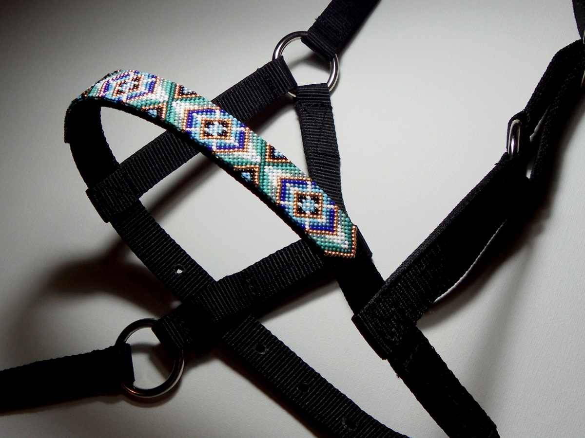 | Dire merci | Oui l'un n'empêche pas l'autre, tu peux utiliser un licol-bijou sur les concours autant de fois que tu veux, du moment que tu en prends soin. Chacun fait ce qu'il veut, si on me commande un licol pour aller patauger dans la boue avec c'est pas mon problème en fait... Je propose un produit, je le fais avec des matériaux que je choisis moi mais je n'interviens pas sur ce qu'il devient après... Coudre le tissage de perles sur du tissu puis coudre le tissu autour des montants ou muserolle ça se fait mais je suis pas fana du rendu, et c'est plutôt pour des bridons en cuir. Je préfère coudre directement sur le support, que ce soit de la corde ou de la sangle. Après tout, c'est aussi pour élargir une gamme de produits et donc élargir la clientèle. Jusqu'ici les licols étho fonctionnent bien et je ne m'attendais pas, en toute franchise, à avoir le nombre de commandes que j'ai eu. Mais voilà en ne ciblant que l'étho on finit par tourner en rond, moi-même je n'utilise pas de licol en corde... donc le licol en nylon est une bonne idée pour viser plus de monde, avec un prix à mi-chemin entre le licol étho et le licol en cuir. Après je garde ton idée du rembourrage, il n'est pas non plus impossible d'en rajouter par la suite, mais du coup sans couture. Peut-être en le collant... faut voir. kagnotte a trouvé le bon système pour incruster les tissages dans le cuir, mais ça c'est son rayon, son expertise! |