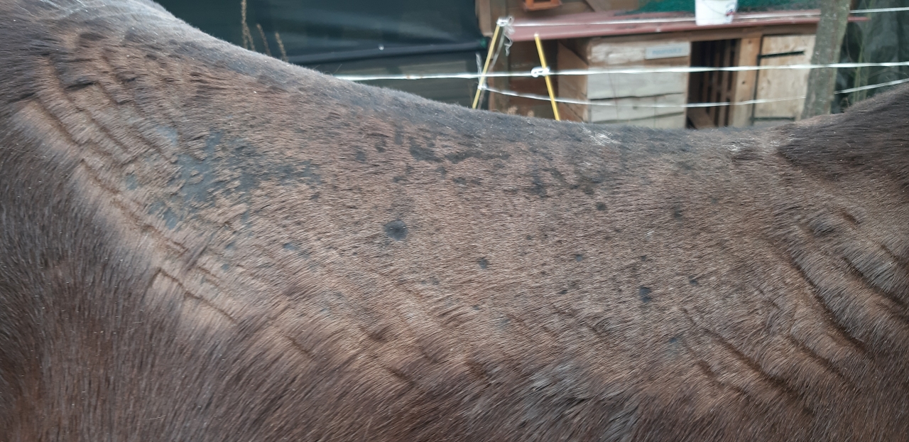 | Dire merci | Le poney a été tondu intégralement à 2 reprises cet hiver, pour éviter justement qu'il transpire trop et que les bactéries prolifèrent. Il double presque de taille avec son poil d'hiver, impossible de voir à quoi ressemble la peau en dessous. Ça nous a permis de mieux soigner ses blessures. Mais avec la couverture ça restait assez étouffé quand même. Il s'est beaucoup abimé à un moment où il était au box, il s'est gratté contre la mangeoire... Là depuis qu'il n'est plus couvert et qu'il est douché régulièrement ça va mieux mais c'est toujours pas ça... Pour l'instant je pense que je vais continuer avec les douches et la brosse pour enlever les peaux mortes et les poils. Je verrai bien comment ça évolue. |