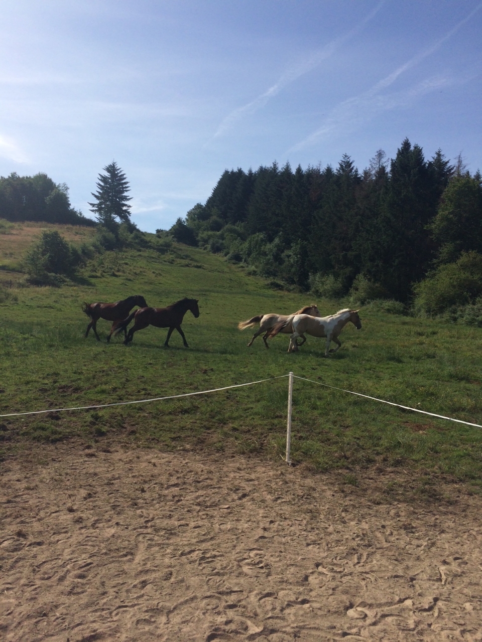 | Dire merci | @luck40 je pense que maintenant qu'on connait les symptômes, on peu ty prendre dès le début et ça évite les inflammations. Mon véto m'a reconfirmé que cette année, c'est une galère toutes ces toux et mouchages... sans parler des fourbures à répétition !!! Endoscopie ce matin, plus d'inflammation, donc on arrête la cortisone, je finis le fond de pot d'avemix. L'année prochaine, moindre toux ou mouchage, anti bio de suite !!! DU coup, elles sont partis avec des copains pendant que je pars en vacance (les miennes sont les plus claires) ![]() Et aucune toux pendant les galopades....OUF ! |