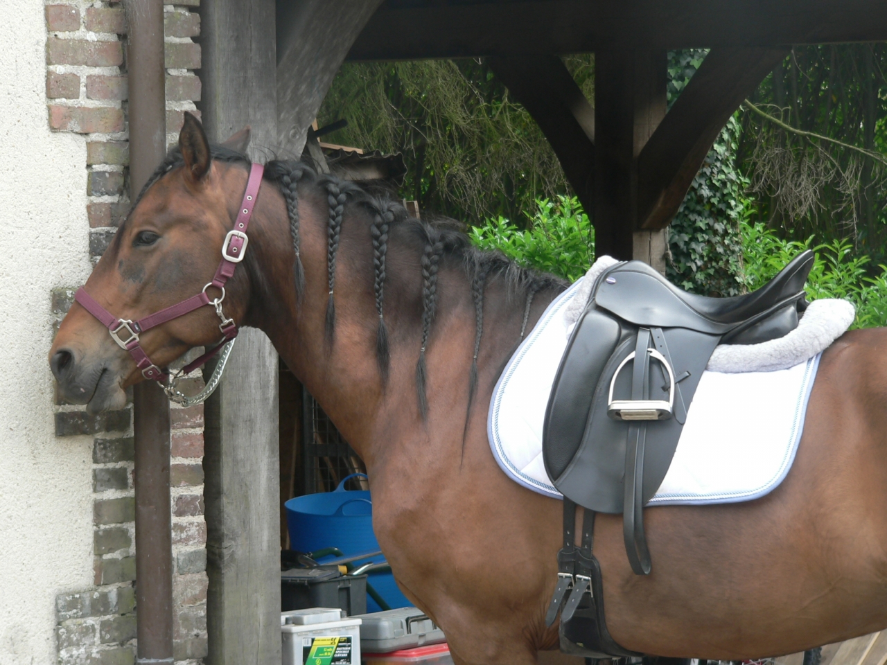 | Dire merci | Essai fait de la Childeric ! Elle s'adapte d'une façon incompréhensible sur le dos du cheval... J'étais très dubitative mais vraiment ça tombe bien et libère l'épaule... ![]() |