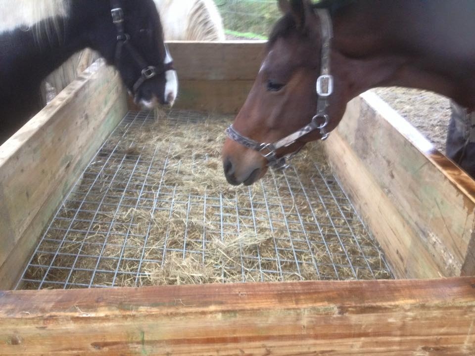 | Dire merci | filet à foin pendant des années, suspendus aux arbres, les chevaux mangeaient le foin par le bas du filet puis au fur et à mesure le filet descendait à terre depuis l'hiver dernier, fabrication de deux caisses en bois avec par dessus grille qui reprend mes filets à foin mis à dimension au final j'ai enlevé les grilles, 14kg de foin par caisse, les chevaux mangent quand ils ont envie, on les remplit matin et soir ![]() |