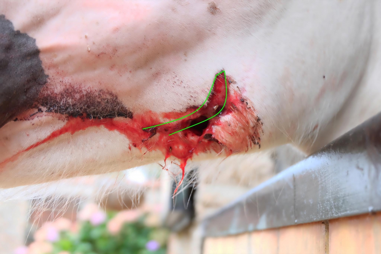 | Dire merci | faust on y a pensé aussi mais selon les 2 vétos qui ont vu la plaie c'est quasiment impossible |