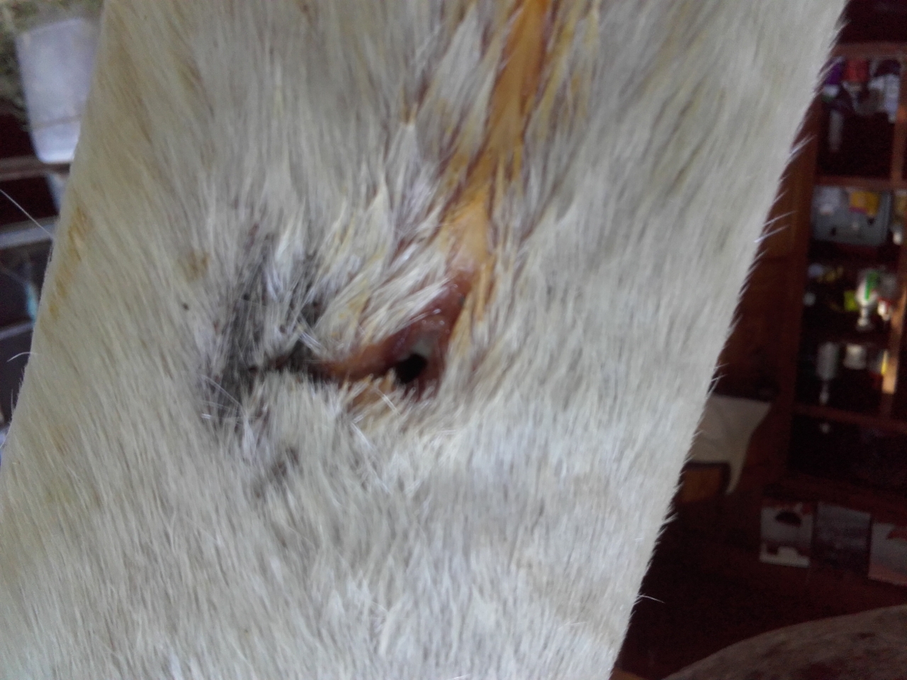 DéconnectéDire merci | Est ce que ça ne ressemblerait aps a une blessure de hameçon ? Les 2 trous, l'un plus petit que l'autre, plus la balafre en angle, m'évoque cela... Un chevreuil qui s'empalle dans un cheval, j'y crois moyen. De toute façon, y a un truc facile a vérifier : si impact extérieur, trou plus grand a l'intérieur. |